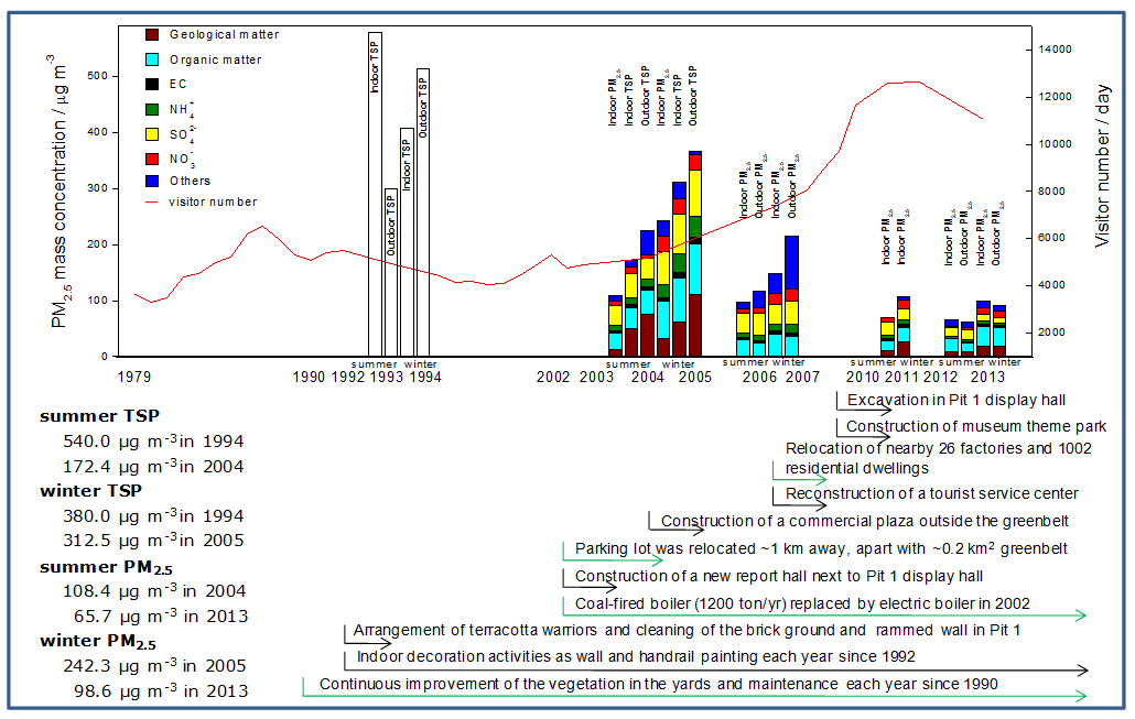 In 2015, KLACP analyzed results of long-term measurements from 1989 to 2013 to evaluate the effectiveness of controls in the Museum (Li et al., 2015). Decreased indoor particulate matter mass was achieved, indicating the benefits from energy innovation and res of parking lots, factories, and residential dwellings in the surrounding area. With the increased tourist flow and restoration work during the past 10 years, indoor activities are of increasing concerns in QTM Museum.
