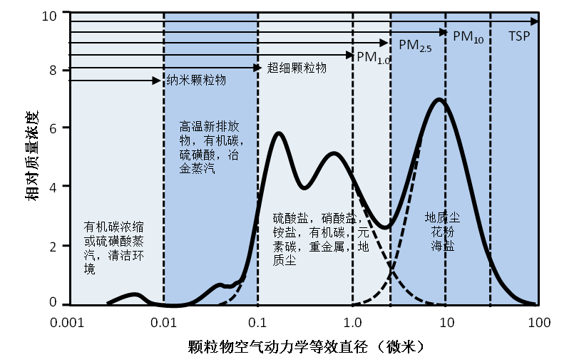 弄清楚了“空气动力学等效直径”的概念,就不难理解环境空气质量研究中的其他几种常见颗粒物了,如TSP,PM10,PM1,超细颗粒物和纳米颗粒物等,它们的定义和PM2.5类似,只是对应着不同的粒径范围,具体的划分及相应的化学组分见图2。