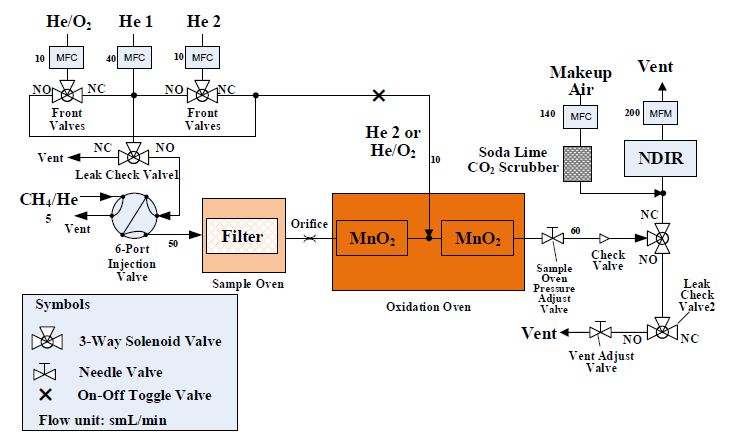 DRI Model 2015原理:基于对OC和EC在不同的温度和环境下进行氧化分析,选取0.526cm2面积的滤膜,根据程序进行升温。OC组分在无氧环境下由低温逐步升温到580℃并逸散出来,EC在含2%的含氧环境中逐步升温到840℃,然后逸散出来。逸散出的碳被氧化成CO2(催化剂为MnO2),CO2顺利获得非色散红外检测器(NDIR)对CO2进行定量检测。使用多波段(如405nm,445nm, 532nm, 635nm, 780nm, 808nm, 980nm)的二级激光管照射样品,测量加热过程中反射光强(或透射光强)的变化用于明确指示出元素碳氧化的起始点,并监测有机碳在加热过程中可能发生的碳化现象(形成黑碳)。同时,多波段激光的使用给予了额外的光学信息,有助于更准确地估计样品中棕色碳(BrC)的浓度和其他相关参数。